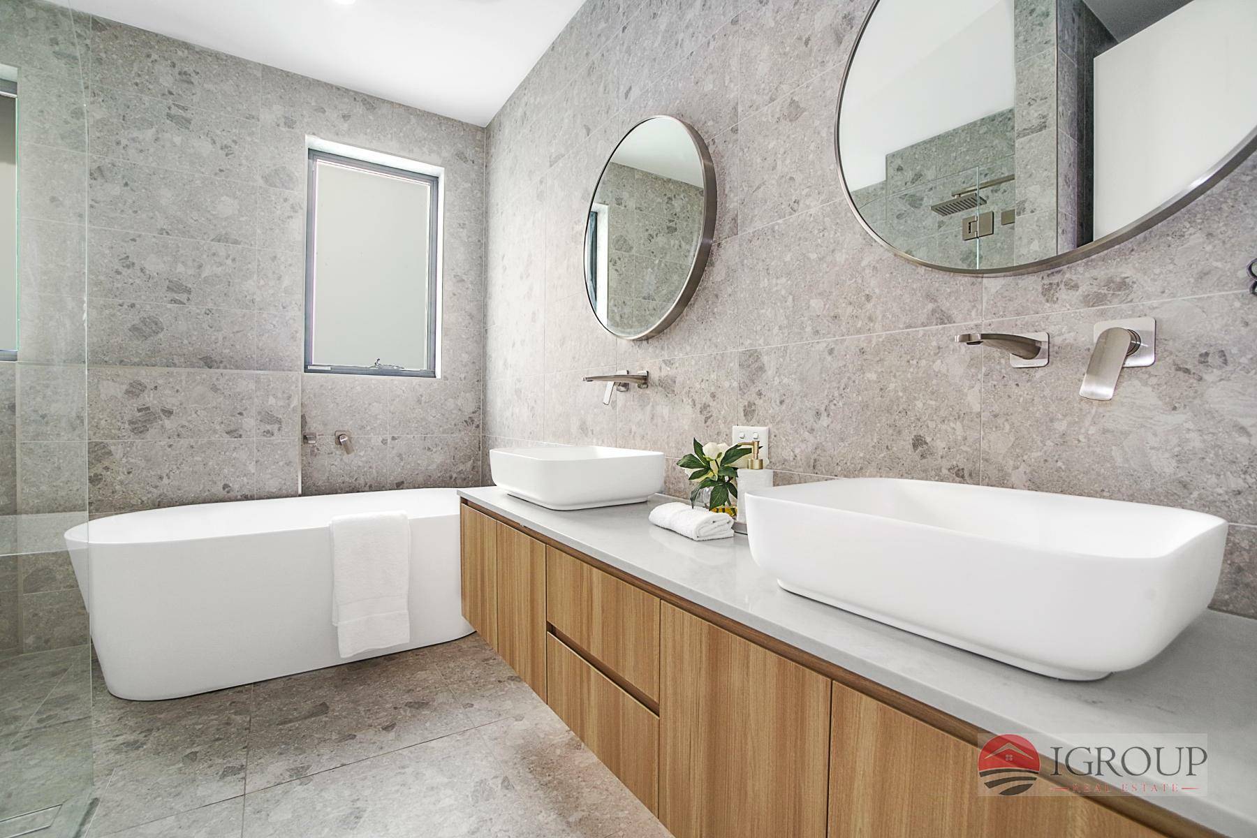 Stylish bathroom with a freestanding bath, separate shower, and double basin