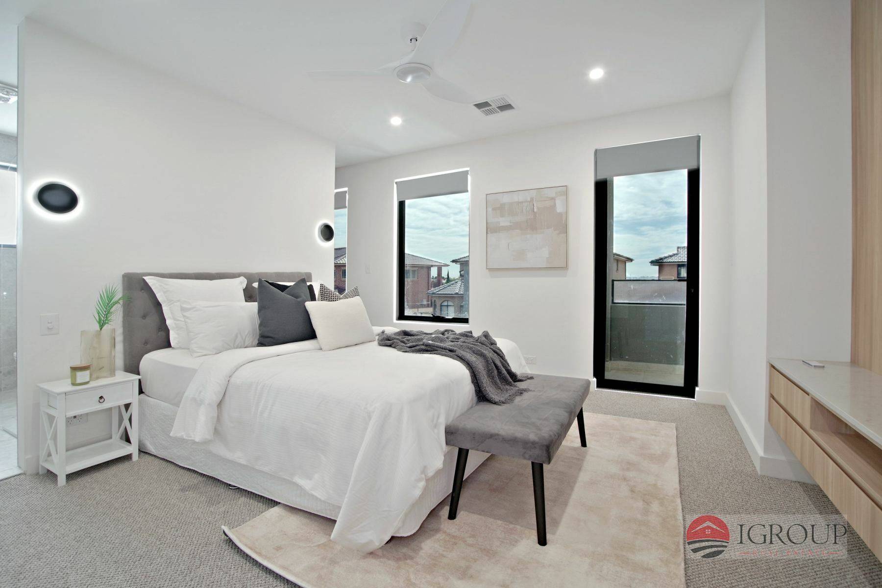 Master bedroom with en-suite, walk-in wardrobe, French balcony, and TV unit setup