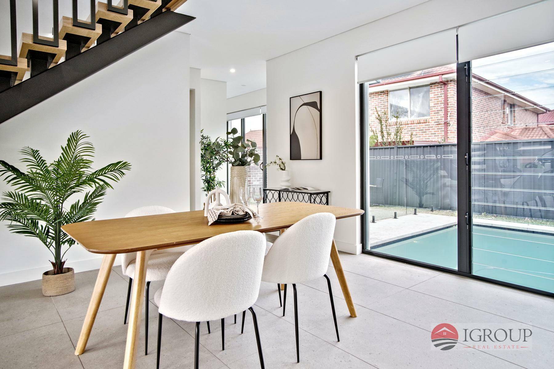 Open plan dining area overlooking the inground pool