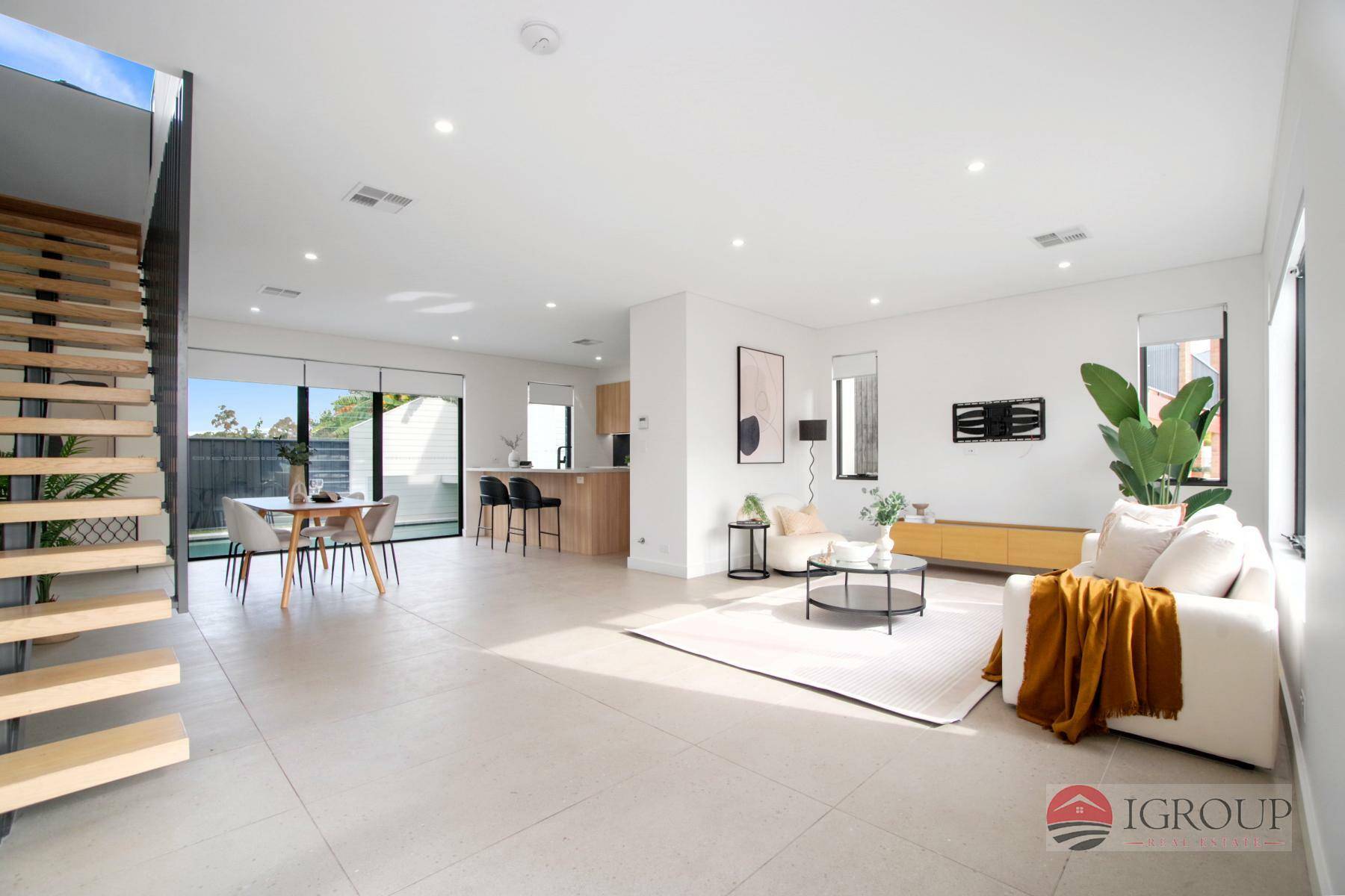 Expansive open living area featuring multiple dining options